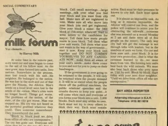 Harvey Milk wrote about the need for citizens to come together to take back their government in his November 27, 1974 column in the Bay Area Reporter.